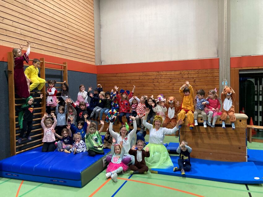 Mit viel Spaß tummelten sich die Jüngsten in der Carl-Gührer-Halle bei ihrem Fasnetsturnen. Während in einem Hallendrittel interessante Geräte lockten, konnten im anderen Hallendrittel sämtliche verfügbaren Fahrzeuge getestet werden. Abschließend trafen sich alle zum Fototermin.