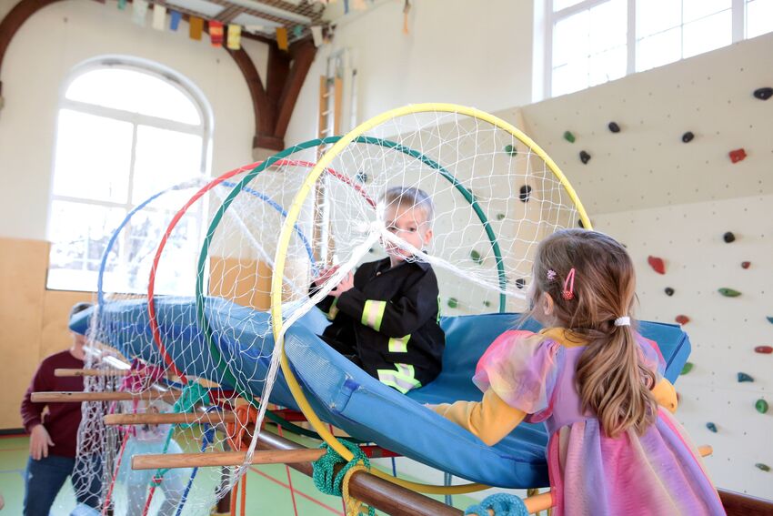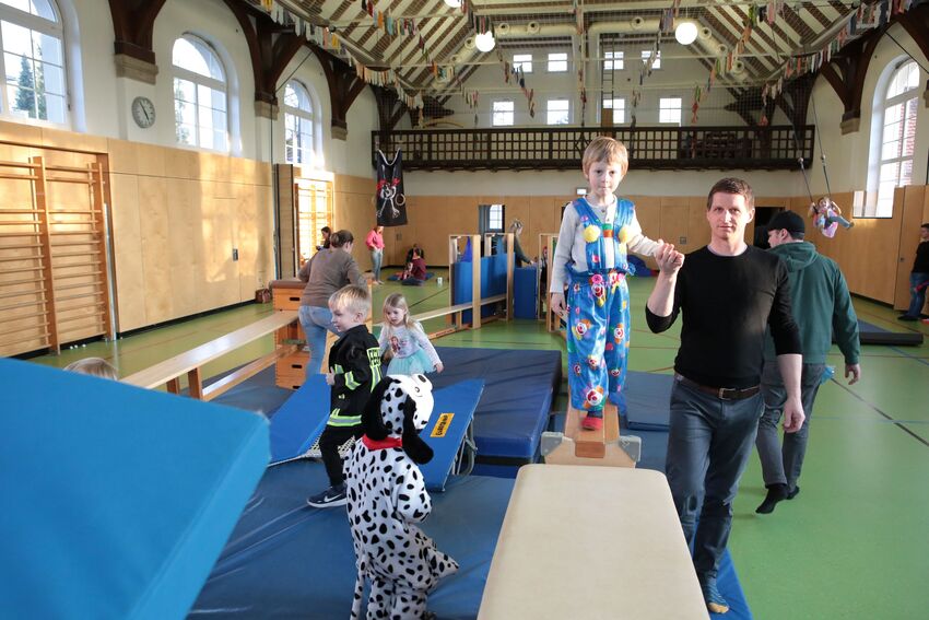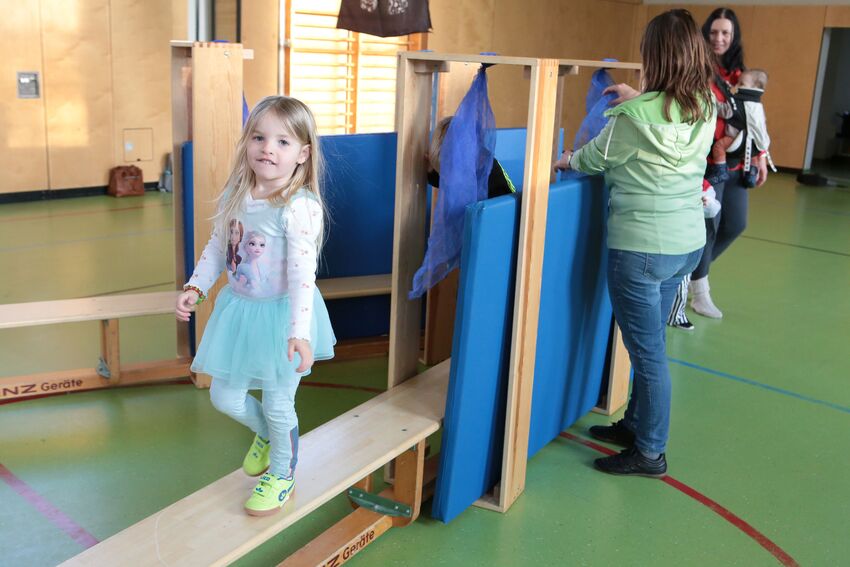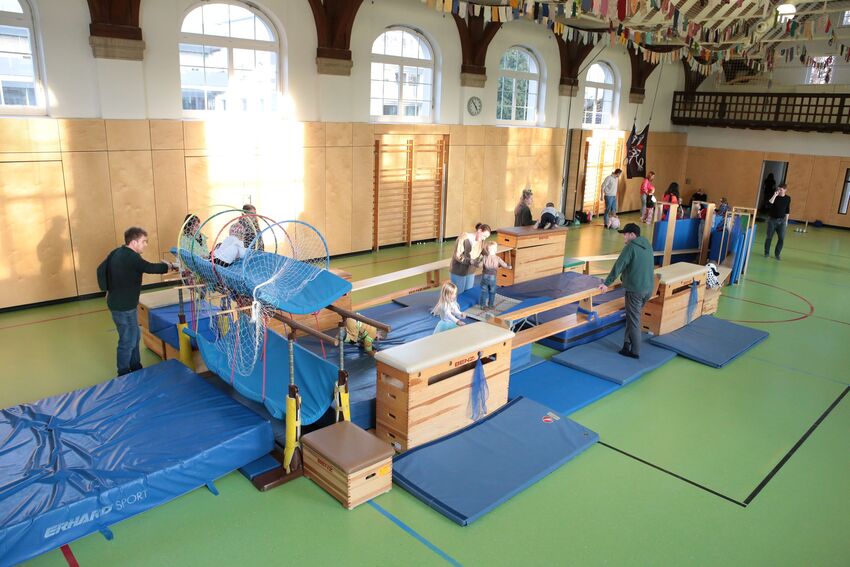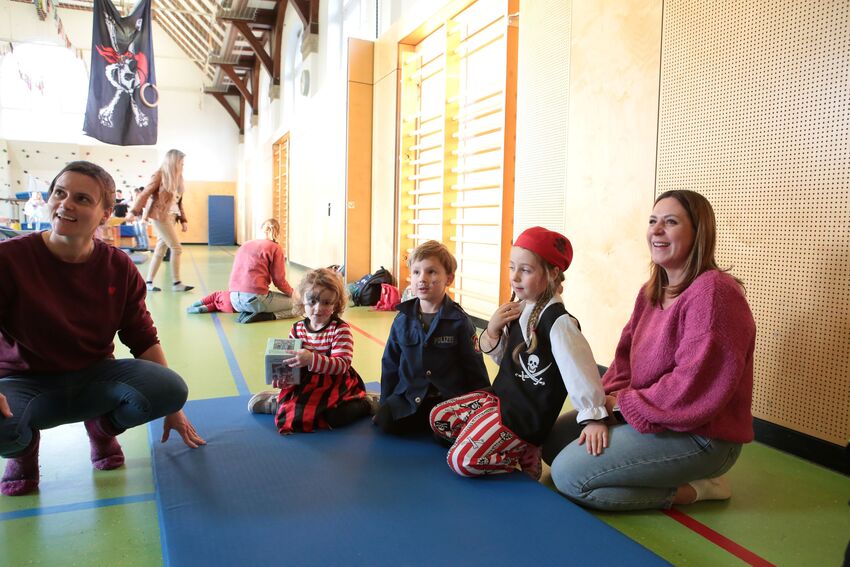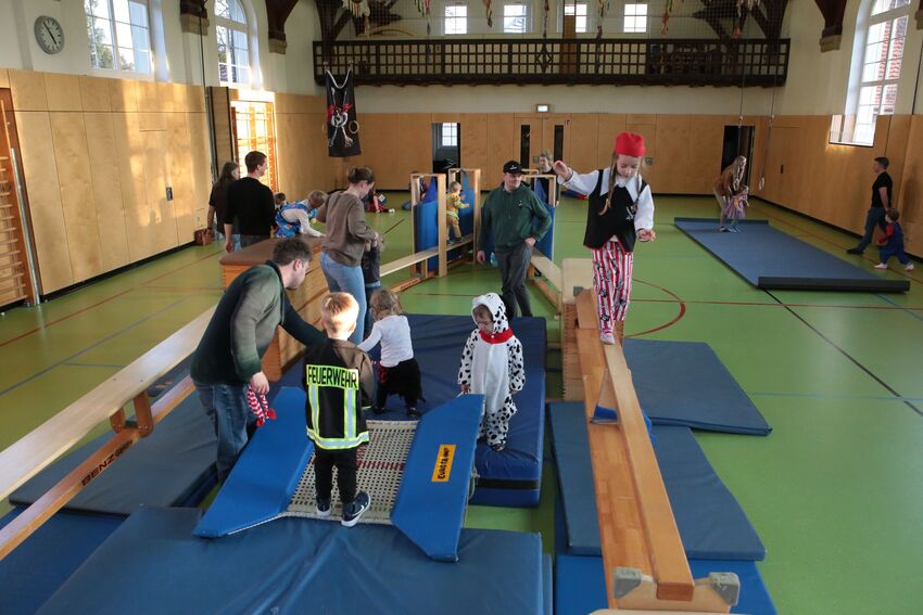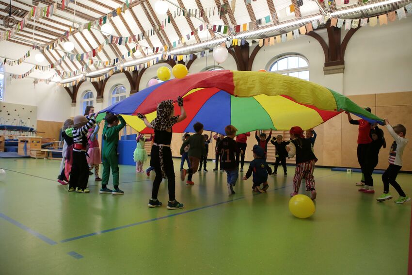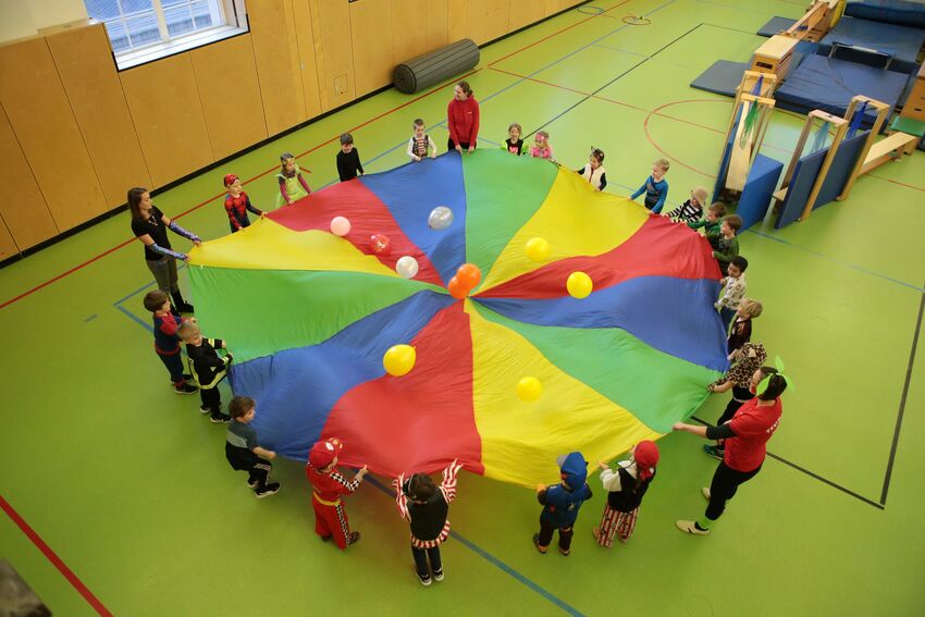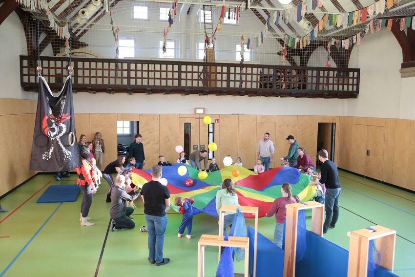 Zu Beginn versammelten sich alle kleinen und großen Piraten unter der Anleitung der Übungsleiterinnen Larissa Schneider, Bianca Kneissler und Sarah Lange in der Halle und starteten mit einem bunten Fallschirmspiel. Der große Fallschirm wurde zum stürmischen Meer: Mal wehten sanfte Wellen, mal brauste ein kräftiger Sturm. Die Kinder liefen darunter hindurch, versteckten sich oder ließen Luftballons wie Schatzkugeln über das „Meer“ rollen.