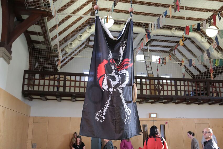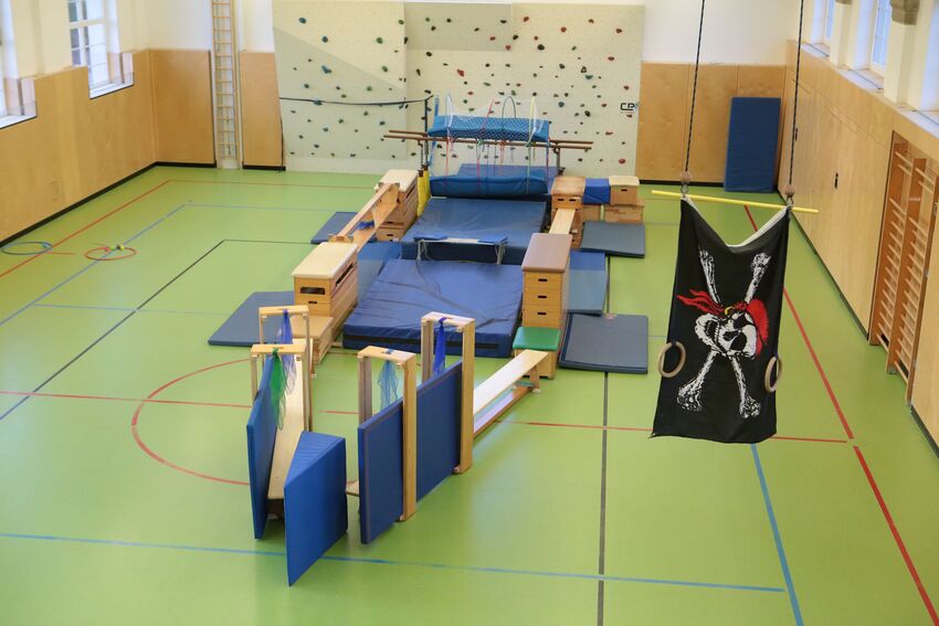 Nach diesem gemeinsamen Einstieg wurde das Piratenschiff geentert! Aus verschiedenen Turngeräten war ein Parcours aufgebaut: Bänke wurden zu Planken, Kästen und Matten zu hohen Wellen und der Barren zum Achterndeck mit Kabinenraum. Auf Balancierstrecken konnten die Kinder über das Schiff klettern und mit dem Trampolin über Deck springen. Mit viel Freude, Mut und Geschick meisterten die kleinen Piratinnen und Piraten die verschiedenen Stationen.