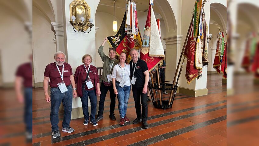 Lange im Vorfeld informierte unser Turnfestwart Marc Franzen die Gruppen darüber, übernahm den Meldevorgang und organisierte die Fahrt nach Leipzig. Neun Mitglieder stiegen dann am Dienstagmorgen in Tettnang in den Bus der Firma Strauss ein, den die TSG Ailingen gebucht hatte und bei denen wir mitfahren konnten. Bei der Ankunft war die erste Überraschung die Schule 5. Eine Containerschule, die einen Kinderhort und Grundschule beinhaltet. Entsprechend klein war die Ausstattung der sanitären Einrichtungen und zum Duschen mussten wir in die fünf Minuten entfernte Oberschule laufen. Das Betreuungsteam der Schule kompensierte aber alles und hat uns sogar Brote zum Mitnehmen vorbereitet. Der Standort dagegen war unschlagbar. Zwei Minuten Fußweg zur Red Bull Arena und sechs Minuten zur Quarterback Arena. Am ersten Abend war die Stellprobe der Vereinsfahnen für die Eröffnungsfeier am Mittwoch, an der Marc Franzen und Hendrik Sinnstein den TSV repräsentierten. Anschließend wurde unsere Fahne zusammen mit weiteren 56 Fahnen die Woche über im neuen Rathaus der Öffentlichkeit präsentiert.