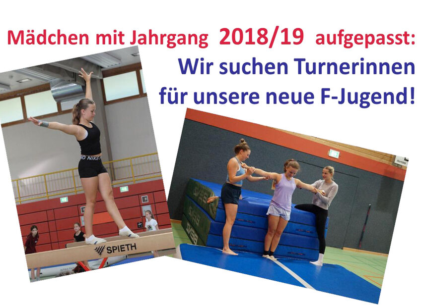 Zum Sichtungsturnen für alle Mädchen mit Jahrgang 2018 & 2019 laden wir am Dienstag, den 28. April 2026 ODER am Donnerstag, den 30. April 2026 um 17:00 Uhr in die Carl-Gührer-Halle ein. Gegen 18:30 Uhr sind wir fertig. Bitte bringt Sportkleidung und Mama oder Papa mit. Bei Fragen: 01 76 / 21 66 18 01 (Miriam Feldengut).