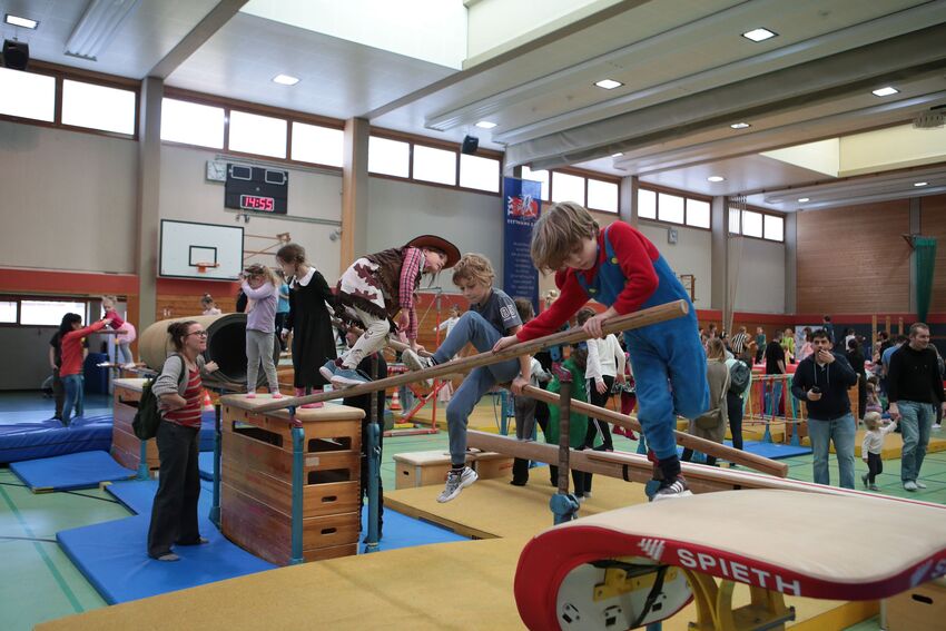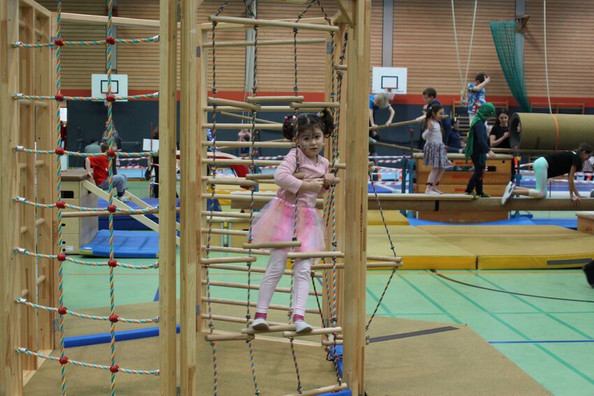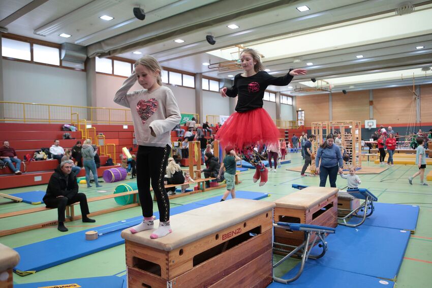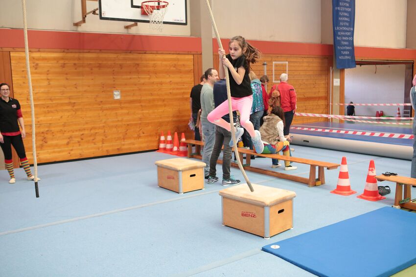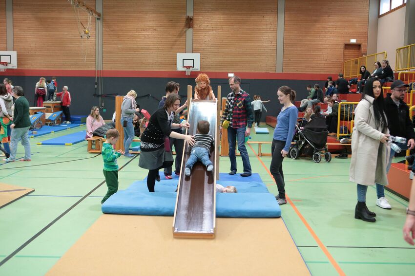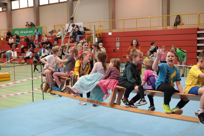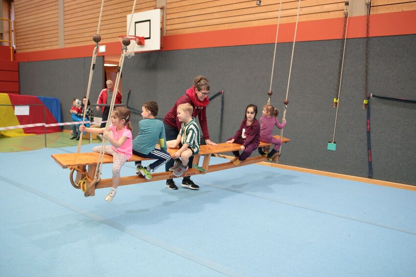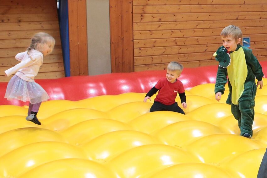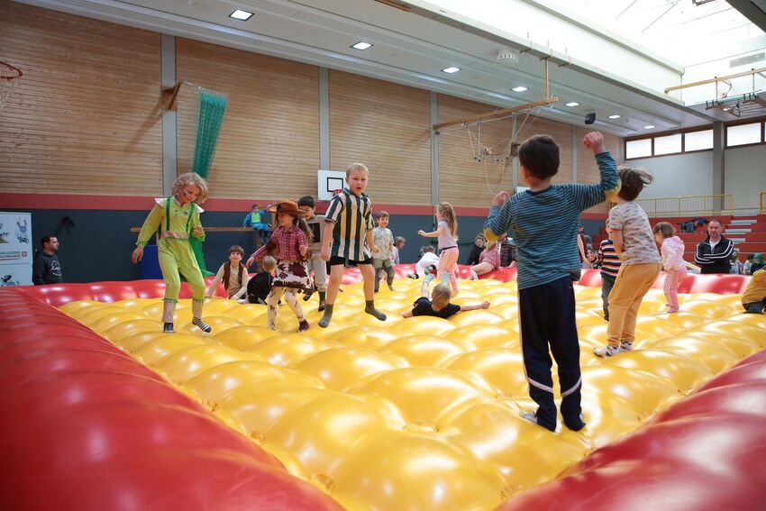 Klettern, schwingen, hüpfen, balancieren, rennen: Die TSV-Turnabteilung hatte die Carl-Gührer-Halle am letzten Fasnets-Wochenende in eine riesige Bewegungslandschaft verwandelt. Mini-Trampolin, Rutsche, Seile zum Schwingen, Airtrack - alles war vorhanden, was die Kinder brauchten, um sich auszutoben. Vor allem die Riesenschaukel, aber auch die Gruselhöhle und der Rollbrett-Parcours erfreuten sich großer Beliebtheit. Absoluter Renner war wieder das große AirTramp, das fast durchgehend voll besetzt war, während die kleinesten im für sie abgetrennten Spielbereich die verschiedenen Geräte erkundeten.