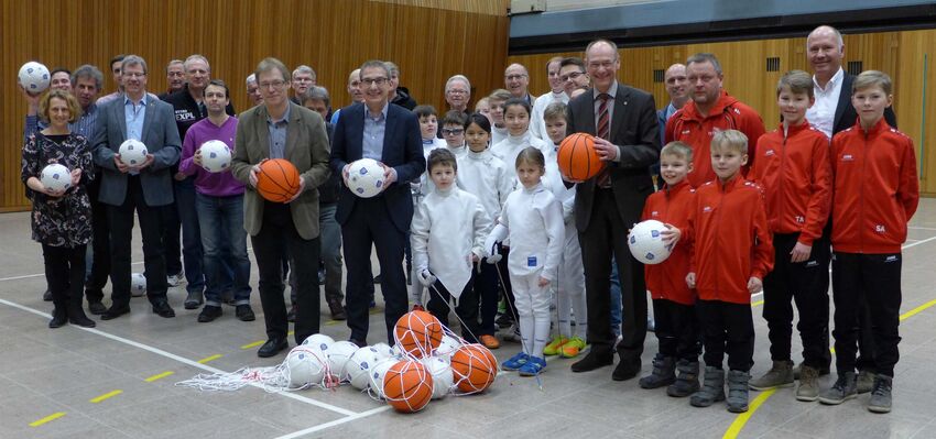 Vorne im Bild: Harald Franzen, Geschäftsführer TSV 1848 Tettnang e. V., Bürgermeister Bruno Walter, Landrat Lothar Wölfle gemeinsam mit jungen Sportlern des TSV Tettnang und Vertreterinnen und Vertretern der betroffenen Schulen, Sportvereine und der Bürgerschaft.