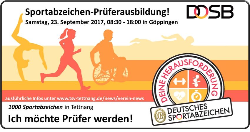 Unterstützen sie uns mit ihrer Ausbildung zum Sportabzeichenprüfer im TSV Tettnang. In dem eintägigen Lehrgang wird die Regelkunde in Leichtathletik, Schwimmen, Radfahren und Gerätturnen vermittelt. Außerdem erhalten Sie Hinweise zur Bearbeitung und Beantragung des Deutschen Sportabzeichens. Bereits aktive Sportabzeichenprüfer können die Weiterbildung zur Abnahmeberechtigung für Menschen mit Behinderung belegen.
