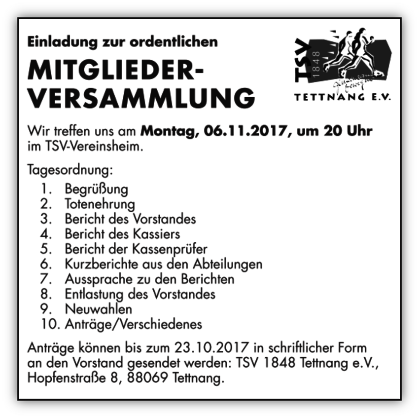 Anträge zur Tagesordnung können bis zum 23.10.2017 in schriftlicher Form an den Vorstand gesendet werden: TSV 1848 Tettnang e. V., Hopfenstr. 8, 88069 Tettnang