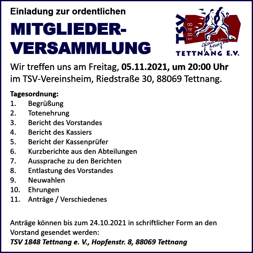Aufgrund der aktuellen Coronasituation ist für die Teilnahme eine Anmeldung auf der Webseite tsv-tettnang.de bis zum 05.11.2021 – 12:00 Uhr erforderlich. Außerdem gilt die 3G-Regel sowie Maskenpflicht. Diese Jahreshauptversammlung wird sich auf die nötigsten Inhalte beschränken. So sehr wir uns über eine rege Beteiligung freuen, bitten wir jeden seine Teilnahme sorgsam abzuwägen. Die Plätze im TSV Vereinsheim sind begrenzt.
