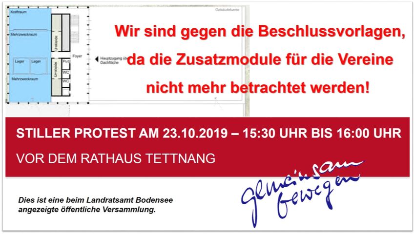 Auf der Beschlussvorlage zur neuen Sporthalle am Manzenberg sind die dringend benötigten Vereinsmodule ausgeschlossen und werden somit nicht realisiert. Den Bedarf müssen wir mittels stillem Protest vor dem Rathaus zwischen 15:30 Uhr und 16:00 Uhr signalisieren. Wir können tagsüber während der Schulzeit keinen Sport mehr anbieten, da die Hallen von den Schulen belegt sind. Der Kraftraum unter dem Stadion wird in Zukunft geschlossen werden.