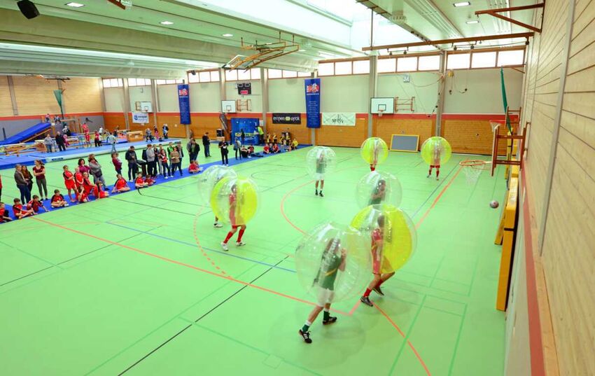 Tettnang sz Mit dem TSV-Erlebnistag am Samstag hat der TSV Tettnang nach über einem Jahr Vollsperrung die Carl-Gührer-Halle offiziell wieder eröffnet. Nach dieser langen Zeit des Stillstandes demonstrierten die Veranstalter mit einem actionreichen und sportartenübergreifenden Programm bewusst, wie viel Leben der Sport in die Halle und somit auch in Tettnangs Bevölkerung bringt. Die offizielle Eröffnung übernahmen Bürgermeister Bruno Walter, TSV-Vorstand Harald Franzen und – für die Tettnanger Schulen – Christine Hild als stellvertretende Schulleiterin des Montfort-Gymnasiums. Bruno Walter ließ zunächst das Jahr Revue passieren. Insbesondere die Erinnerungen an den nächtlichen Telefonanruf im September 2013, der ihn von dem verheerenden Brand in Kenntnis setzte, teilte Walter mit dem Publikum. Sein Dank galt neben TSV-Vorstand Harald Franzen und Siegfried Madlener vom städtischen Bauamt auch allen umliegenden Vereinen, Schulen und letztlich allen TSV-Mitgliedern, die dieses Ereignis möglich machten. Aus Sicht der Schulen berichtete Christine Hild: „Wie so oft spürten wir auch hier erst, was wir an dieser Halle hatten, als sie uns nicht mehr zur Verfügung stand. Insofern sind wir jetzt sehr dankbar dafür, dass unsere Schüler sie nun wieder nutzen können.“ Bevor das „rote Band“ per Scherenschnitt von allen drei Festrednern durchtrennt wurde und Walter einen symbolischen Schlüssel an Schulen und TSV übergab, richtete auch TSV-Vorstand Franzen das Wort an die Gäste. „Wir danken insbesondere den umliegenden Vereinen, die viele TSV-Abteilungen aufgenommen haben und es uns so ermöglicht haben, unseren Sport weiter auszuüben. Das ist nicht selbstverständlich.“ Als kleines Dankeschön überreichte er anwesenden Vertretern dieser Vereine Präsente in Form von Hand-, Basket- und Volleybällen sowie Turnequipment. Das neue Prachtstück konnte dann vom Publikum genauer unter die Lupe genommen und direkt „ausprobiert“ werden. Den Auftakt machte das „Bumperz“-Promispiel mit Vertretern des TSV und der Stadt Tettnang. In durchsichtige, luftgepolsterte Kugeln verpackt, hatten die Spieler bei dieser außergewöhnlichen Art des Fußballs ihren Spaß. Nicht weniger amüsant war das Match, das die Stadt mit 6:5 für sich entschied, für die Zuschauer. Eine Bewegungslandschaft lud insbesondere Kinder dazu ein, die neuen Geräte selbst auszutesten. Die Vorführung der Tettnanger Tae-Kwon-Do-Gruppe, Mitmachangebote der Sportarten Handball und Basketball sowie der Cross-Fit-Wettkampf und die Action-Wall machten dem Anspruch des TSV „gemeinsam bewegen“ alle Ehre.