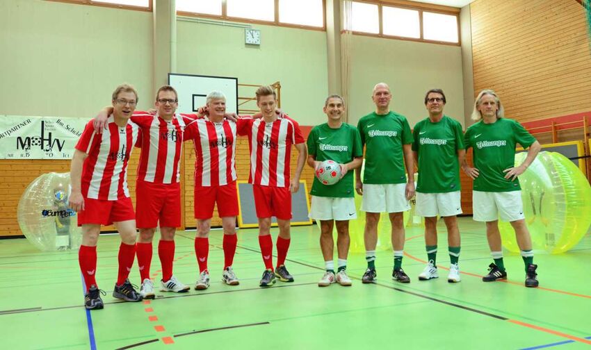 Aber erst einmal kam eben der offizielle Teil. Bürgermeister Bruno Walter schilderte in seiner Ansprache, wie er Nacht vom 28. September 2013 erlebt hatte. Damals wurde an der Halle Feuer gelegt. Es sei zunächst nicht absehbar gewesen, dass die Tettnanger Schulen und der TSV ein ganzes Jahr auf diese wichtige Sportstätte würden verzichten müssen. Die Verwaltung entschied sich, nicht nur die durch den Brand entstandenen Schäden zu sanieren, sondern auch die in die Jahre gekommene Haustechnik samt Brandschutzeinrichtung zu modernisieren. „Nun haben wir eine Halle bekommen, die den Ansprüchen von Schule und Verein voll gerecht wird“, sagte Walter. Er bedankte sich vor allem bei seinem Projektleiter Siegfried Madlener, der die Sanierung umsichtig geplant und geleitet hatte, und bei TSV-Geschäftsführer Harald Franzen, der sich in vielen Stunden Arbeit und in vielen Gesprächen für ein optimales Ergebnis eingesetzt hatte. Auch Christine Hild vom Montfort-Gymnasium als Vertreterin der Schulen und Harald Franzen betonten das gute Miteinander zwischen Schulen, Verein und Stadt. Franzen bedankte sich auch bei Vertretern anderer Sportvereine aus den umliegenden Gemeinden, die dem TSV mit Hallen- und Trainingszeiten in seiner misslichen Lage sehr geholfen hatten. Und dann gehörte die Halle endlich den großen und kleinen Sportlern, die während der Vorführungen der einzelnen Vereinsabteilungen nicht nur einiges zu sehen bekamen, sondern sich auch selbst ins Zeug legen konnten. Auch Bruno Walter hatte sein Sportsäcklein geschultert und lief nun zusammen mit seinen Mitarbeitern Gerd Schwarz und Hans-Jürgen Pfister sowie mit Gemeinderat Hans Schöpf auf dem Spielfeld auf, um in einem Bubble-Fußballspiel gegen eine TSV-Auswahl aus Harald Franzen, Oliver Schneider, Norbert Sinnstein und Julian Locher anzutreten. Dabei steckten die Spieler in großen, luftgefüllten Kugeln und rempelten sich naturgemäß ständig über den Haufen. Den Sieg und einen Fußball als Preis trug die Auswahl der Stadt nach einem schweißtreibenden 6:5 davon. Der mittlere Hallenteil war als Vorführfläche den Vereinsabteilungen vorbehalten. Ob Taekwondo oder Handball, Basketball oder Turnen: Der TSV nutzte die Plattform des Erlebnistages optimal, um Vielfalt und Leistungsfähigkeit zu zeigen und machte so Lust, Sport zu treiben. So wie viele Besucher hatte die Tettnangerin Silvia Bebek mit der ganzen Familie den Tag zum Schnuppern genutzt und sich gezielt über die Angebote informiert. Ihr vierjähriger Sohn Nils, befragt darüber, wie es ihm gefallen habe, hatte da nur einen Kommentar parat: „Gut!“. Es war allerdings nicht auszumachen, ob er nicht vielleicht auch der Apfelkuchen auf dem Teller vor ihm gemeint haben könnte.