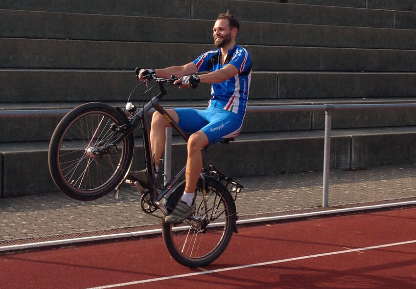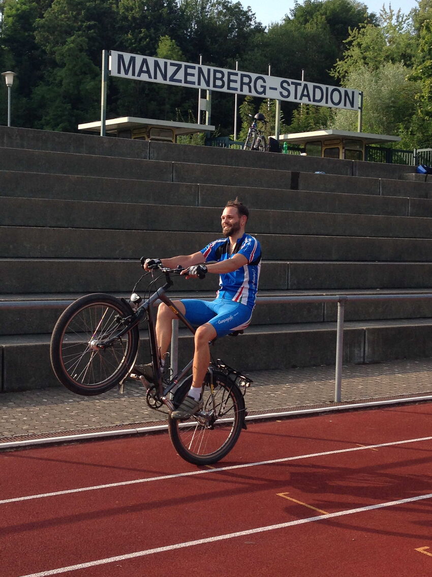Nick Zientner trainiert seit Wochen für das längste „Wheelie“ der Welt. Das heißt, er legt die Strecke ausschließlich auf dem Hinterrad seines Fahrrads zurück. Aus diesem Grunde ist er öfters im Manzenbergstadion anzutreffen wenn er seine Bahnen zieht.