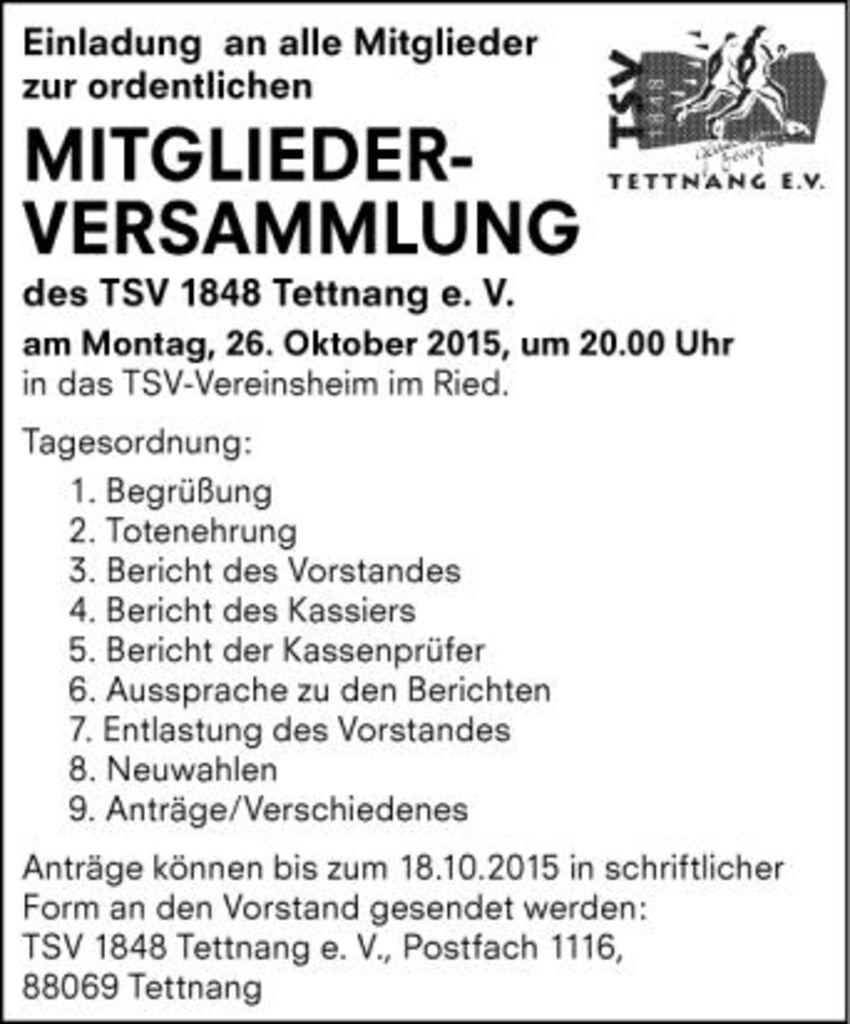Anträge zur Tagesordnung können bis zum 18.10.2015 in schriftlicher Form an den Vorstand gesendet werden: TSV 1848 Tettnang e. V., Postfach 1116, 88069 Tettnang