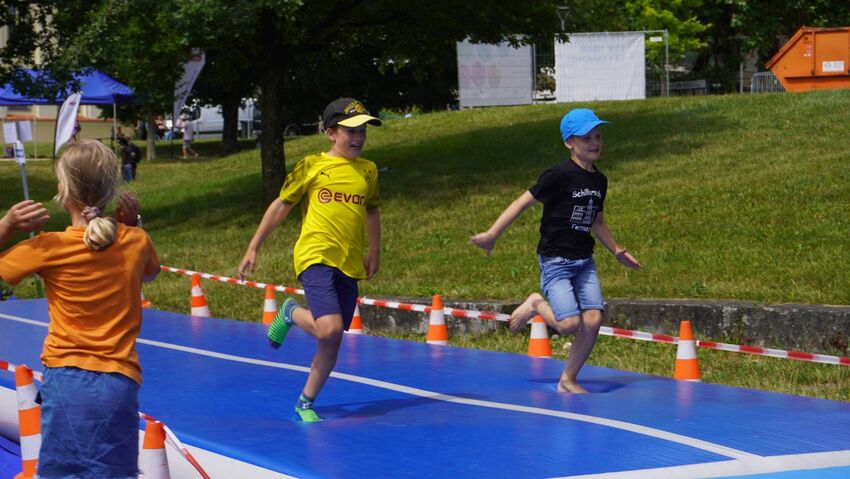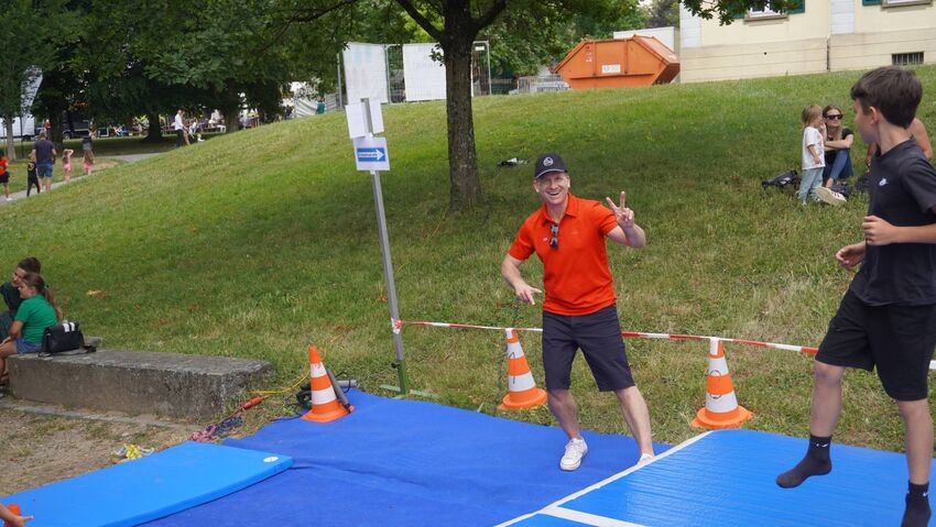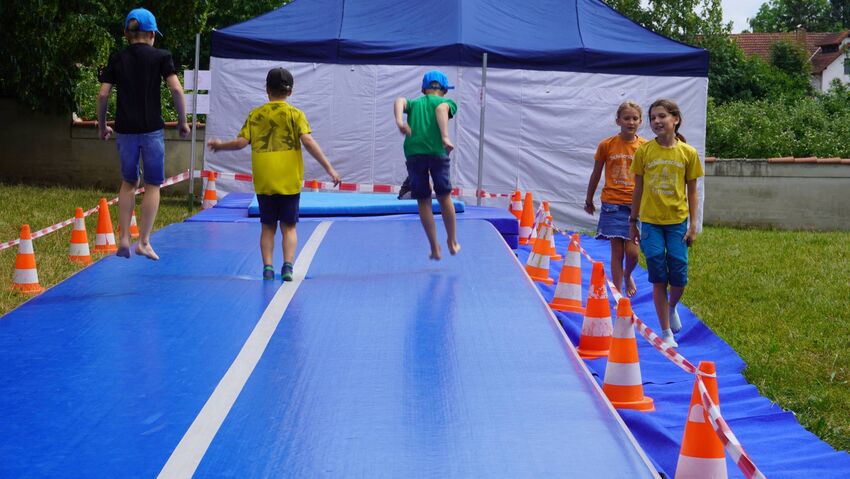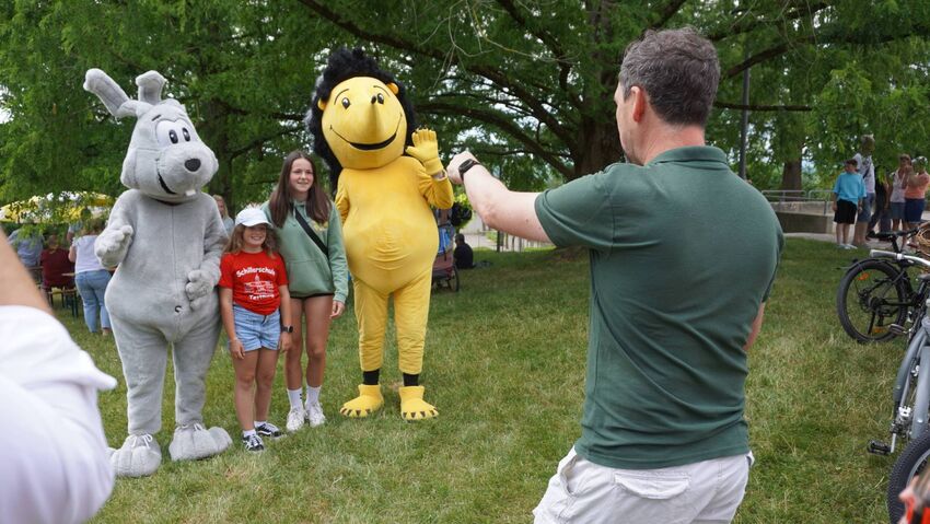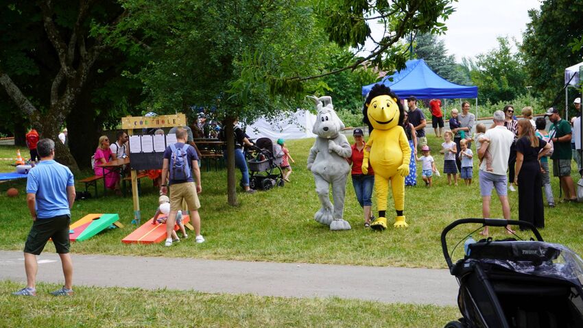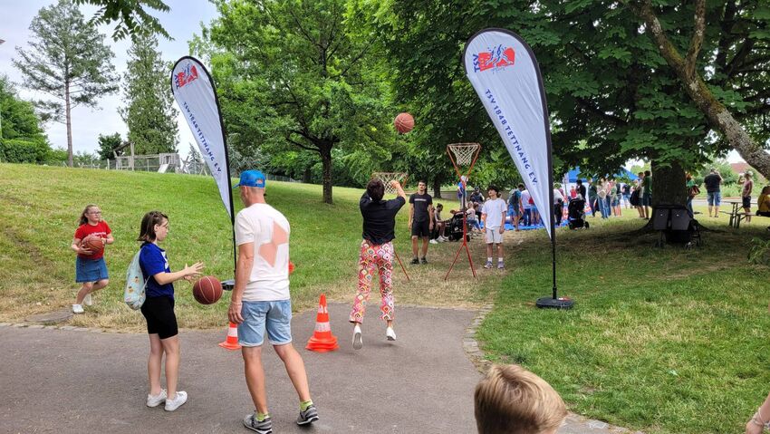 Die Abt. Turnen und Basketball beteiligten sich Rahmen ihres Vereinsjubiläums an der Aktionswiese des Montfortfestes. Hoppel und Bürste - die Maskottchen vom Mini-Sportabzeichen - haben auch vorbei geschaut.