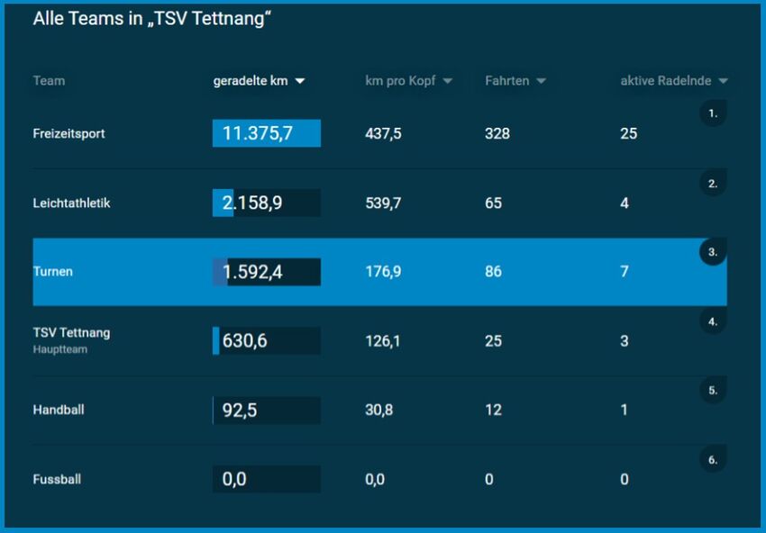 In den 21 Tage hat der TSV 15.850 km geradelt und hat damit in Tettnang den 1. Platz erreicht. Im internen TSV Ranking liegt die Abteilung Freizeitsport mit 11.375,7 km weit vor den Leichtathleten, die es mit 2.158,9 km auf den zweiten Platz geschafft haben. In der km/Kopf Wertung liegen die Leichtathleten mit 539,7 km aber über 100 km vor der Abteilung Freizeitsport.