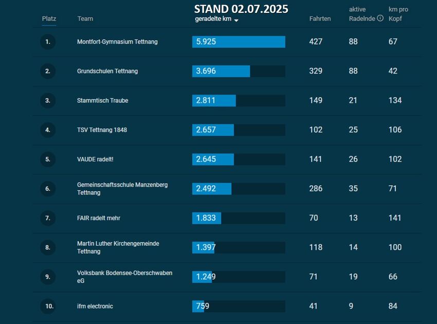 In der Gesamtwertung liegt der TSV mit seinen 13 Teams am 02.07.2025 auf Platz 4. mit seinen 25 aktiven Teilnehmer. Das sind 1% unserer Mitglieder. Da ist noch Luft nach oben.